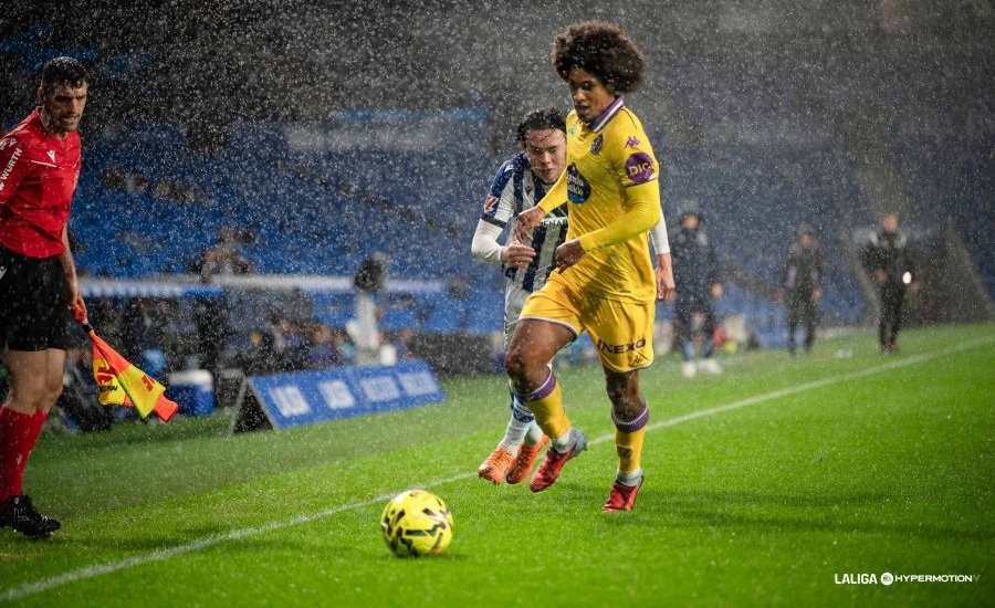 El guion previsto para la contienda se cumplió en los compases iniciales, en los que no hubo un respiro. En estas, entre la presión alta y la verticalidad buscada, el Real Valladolid tuvo un par de aproximaciones al último tercio en los primeros minutos. Esa misma velocidad la pretendían imprimir también los donostiarras, imprecisos a veces desde la figura de Aitor Fraga, pero amenazantes cuando conseguían contactar con Dani Díaz u Ochieng, a los que trataba de hacer llegar el esférico anhelando conductas tan diferentes como lo son sus características.