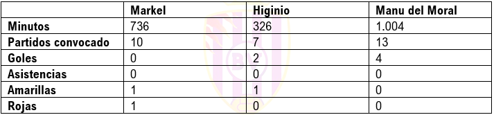 El que más posibilidades tiene de hacerlo es Manu del Moral pues, de los tres, es el que ha tenido mayor número de oportunidades hasta el momento con un total de 1.004 minutos de los 1.440 disputados en la liga, repartidos en los trece partidos en los que ha ido convocado (faltó en la jornada sexta, octava y décima). Además, el delantero ya se ha estrenado como goleador rojillo y ha marcado cuatro dianas en los veinte tiros que ha tenido. Por lo tanto, Del Moral marca un tanto cada 251 minutos y, da la casualidad, que consiguió vio puerta de forma consecutiva ante Córdoba, Alcorcón y Lugo.