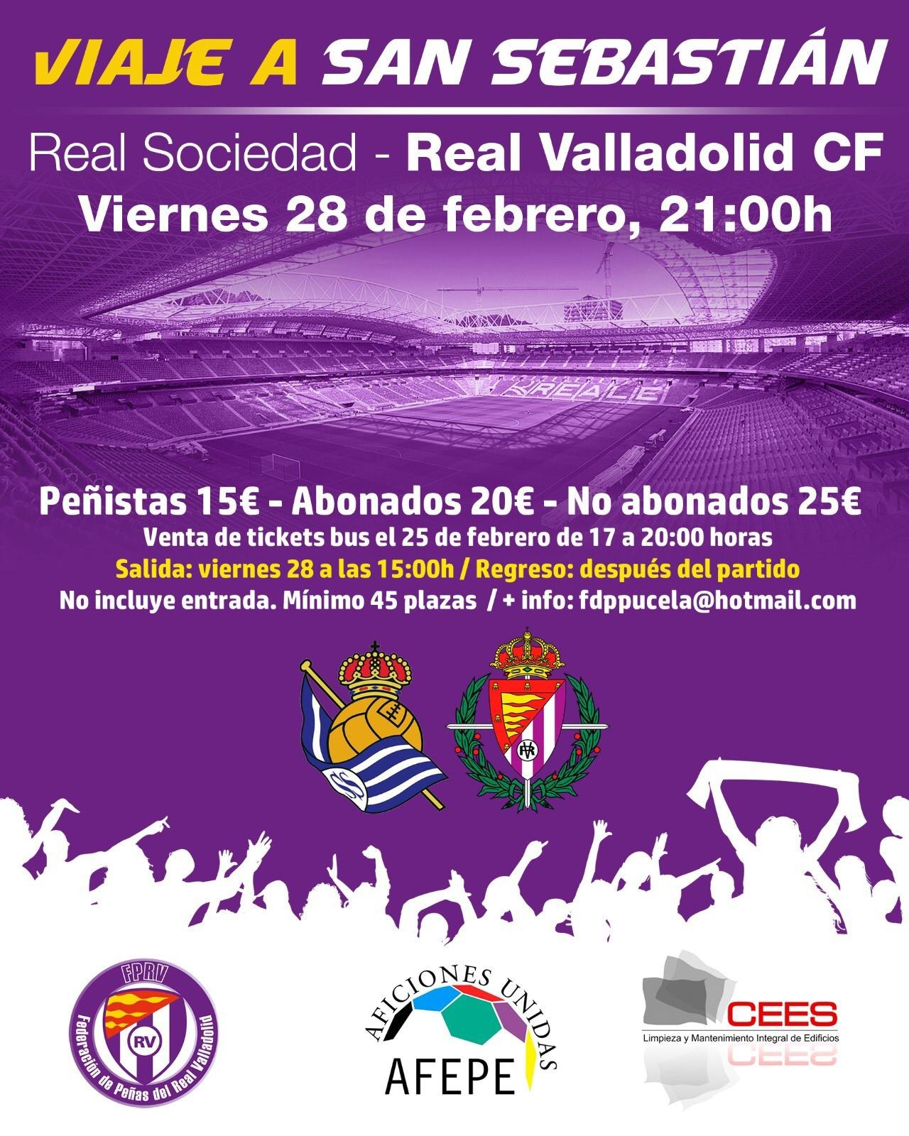 Se acerca el tramo crucial de la temporada y el Real Valladolid no luchará solo. Para apoyar a los de Sergio González, la Federación de Peñas del Real Valladolid organiza un viaje a Anoeta con motivo del encuentro ante la Real Sociedad, que se disputará el viernes, 28 de febrero, a las 21:00 horas.