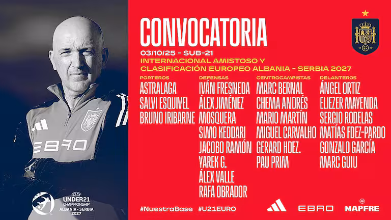 Los dos, con presentes que ratifican la apuesta, en su día, del conjunto pucelano, han sido llamados para las dos citas que vivirá el conjunto español dirigido por David Gordo ante Noruega y Finlandia, el primero en contexto de amistoso, en el Pedro Escartín de Guadalajara, y la segunda como parte de los encuentros clasificatorios del Europeo Sub-21 de 2027, que se jugará en Castalia, Castellón de la Plana. Dos partidos en los que se podrá disfrutar de España Sub-21 el 10 y el 14 de octubre a las 21:00 y a las 18:30 respectivamente.