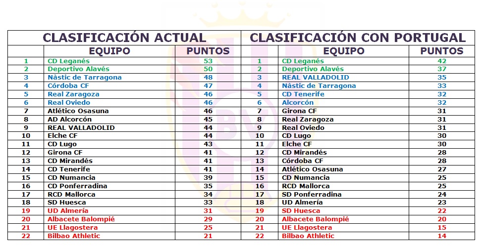 Cumplidas veintiuna jornadas en el banquillo, toda una vuelta, los números hablan por sí solos: las nueve victorias y los ocho empates, por cuatro derrotas –las mismas que en las nueve primeras fechas– han traído 35 puntos. Desechando el funesto comienzo del curso, como se puede ver en la tabla de abajo, el Real Valladolid sería tercero, a solo dos puntos, y no a ocho, del ascenso directo.